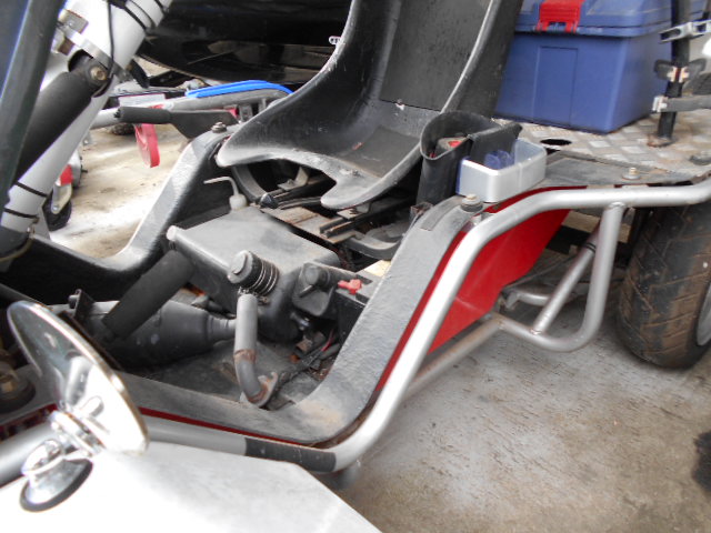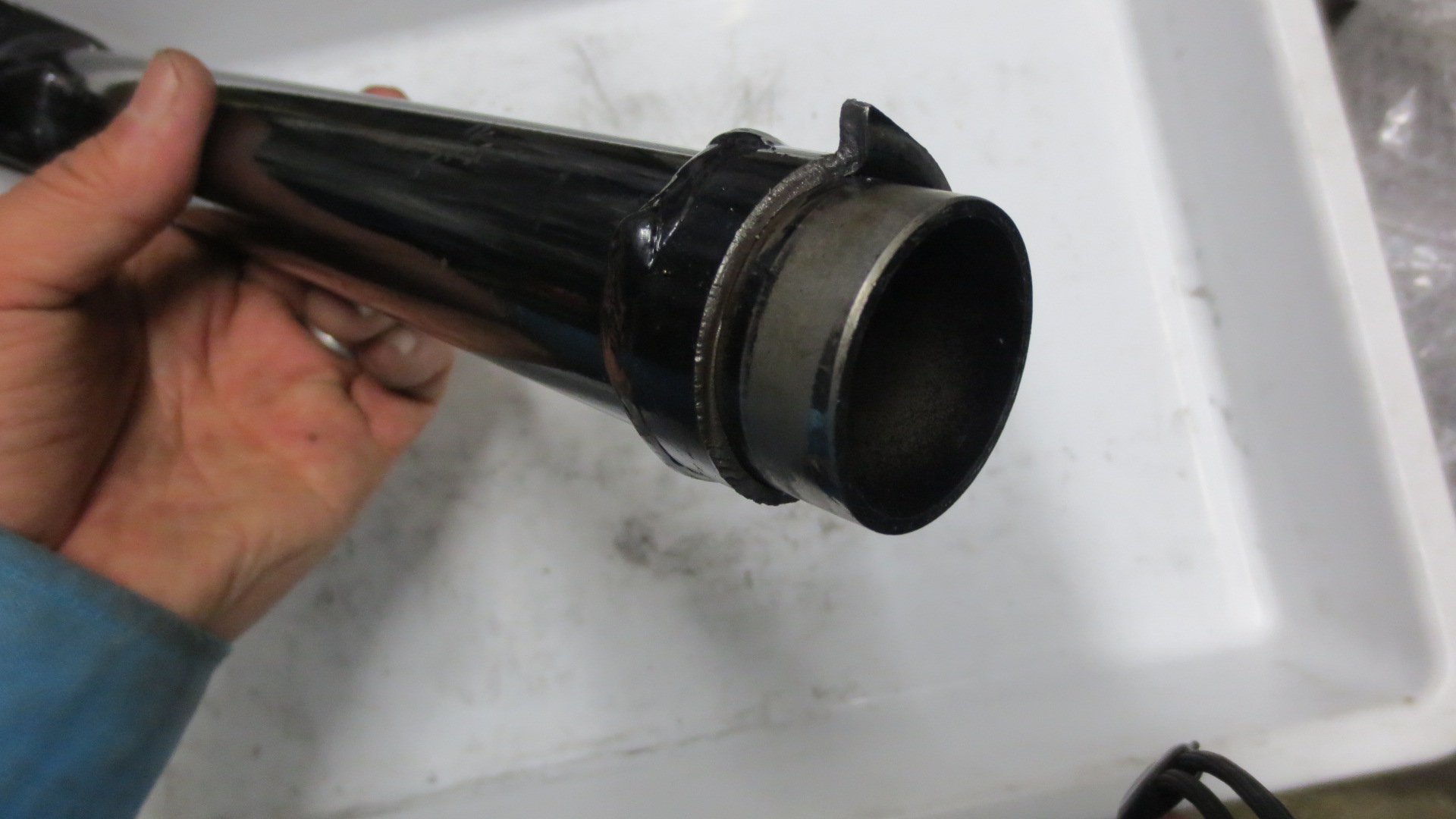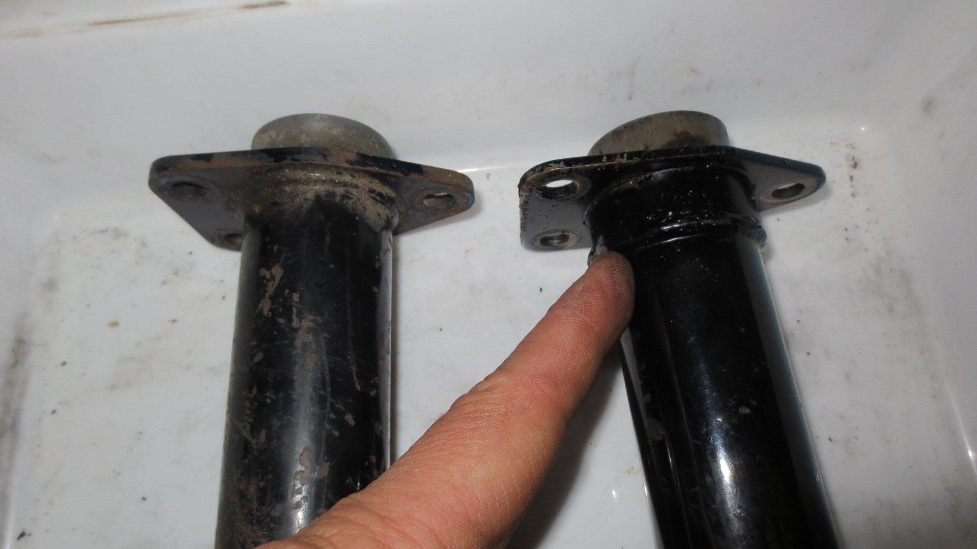 (35)写真下:修理右ホーシング ¥3,000〜 ※エンジン側にはカラーがありませんが、取付板が厚いです。車体へ固定部の穴の片方に別プレートを溶接してあります。又、マフラー取付ボルトの雌ネジをヘリサート修理してあります。