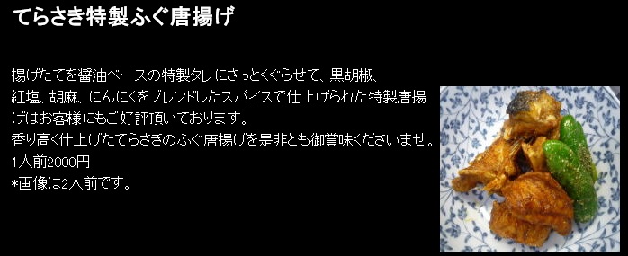 (12/10) 本日、知り合いの魚屋さんから少しですが、トラフグのてっさ、唐揚げ用のアラを購入したので冷凍保存して当日に出します。