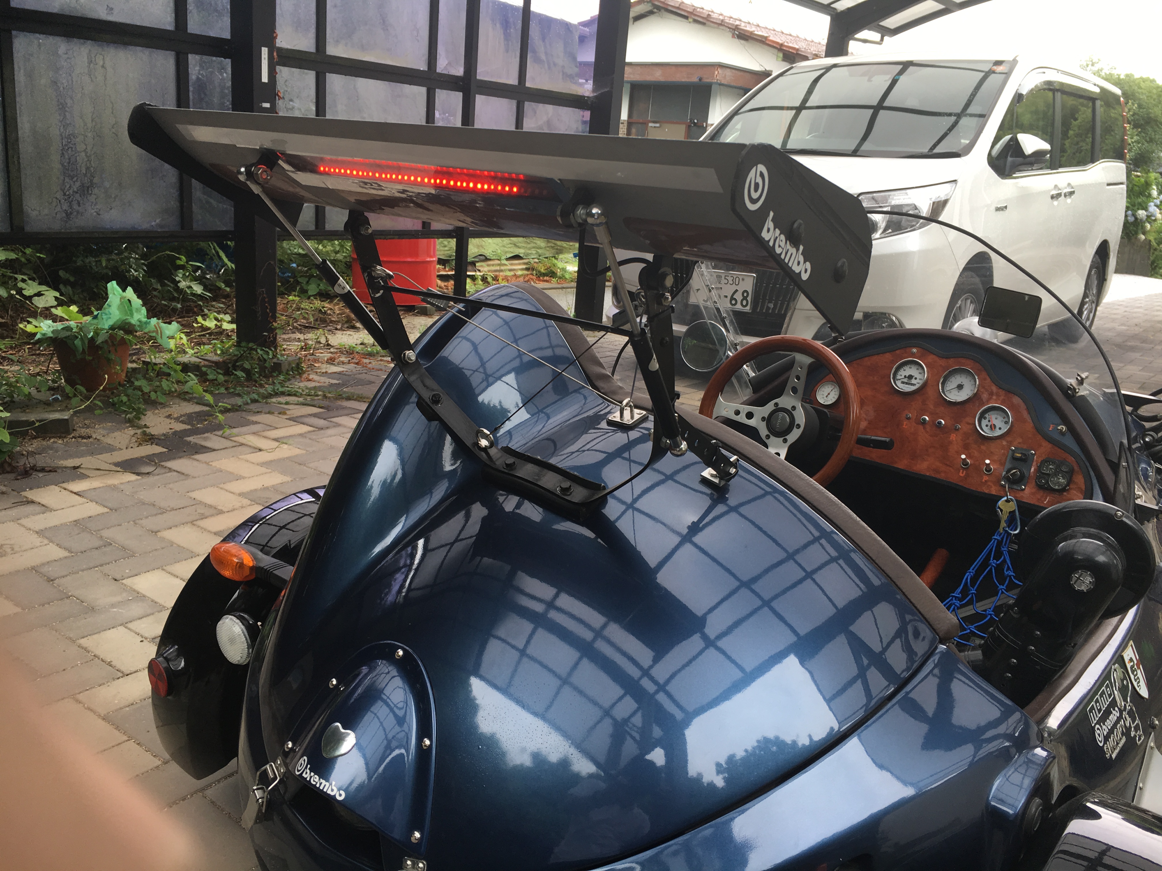 中古のリアウイングを買って 切り抜いてテールランプを埋込み透明のアクリルを貼りました。