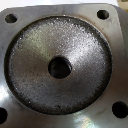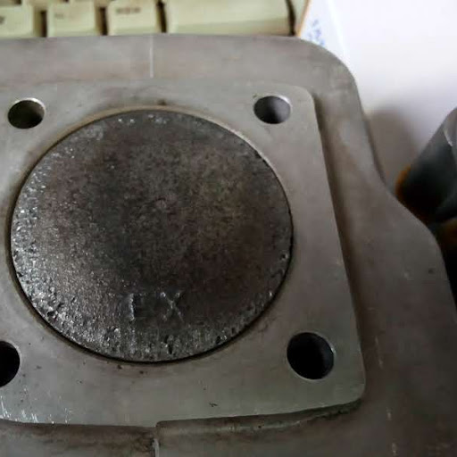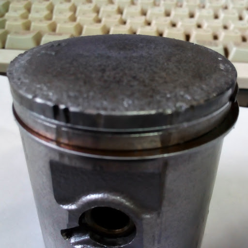 以前、オイル切れでピストン&シリンダーにキズがありクランキングが重い症状でしたので点検してみたところ、ピストン上部外周ヘッド外周にショット痕とピストン側面上部に異物を噛んだ様なキズとピストンリングの上が固着してました。