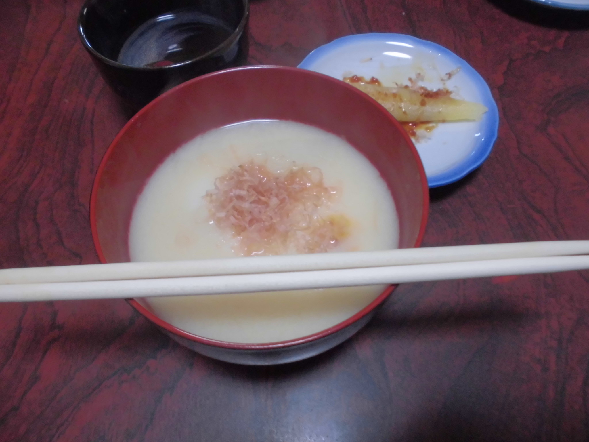 餅にきな粉を付けて食べるのは聞いたことはありますが、我が家では澄まし汁+丸餅です。ちなみに私は奈良市、嫁さんは大和郡山市出身です。