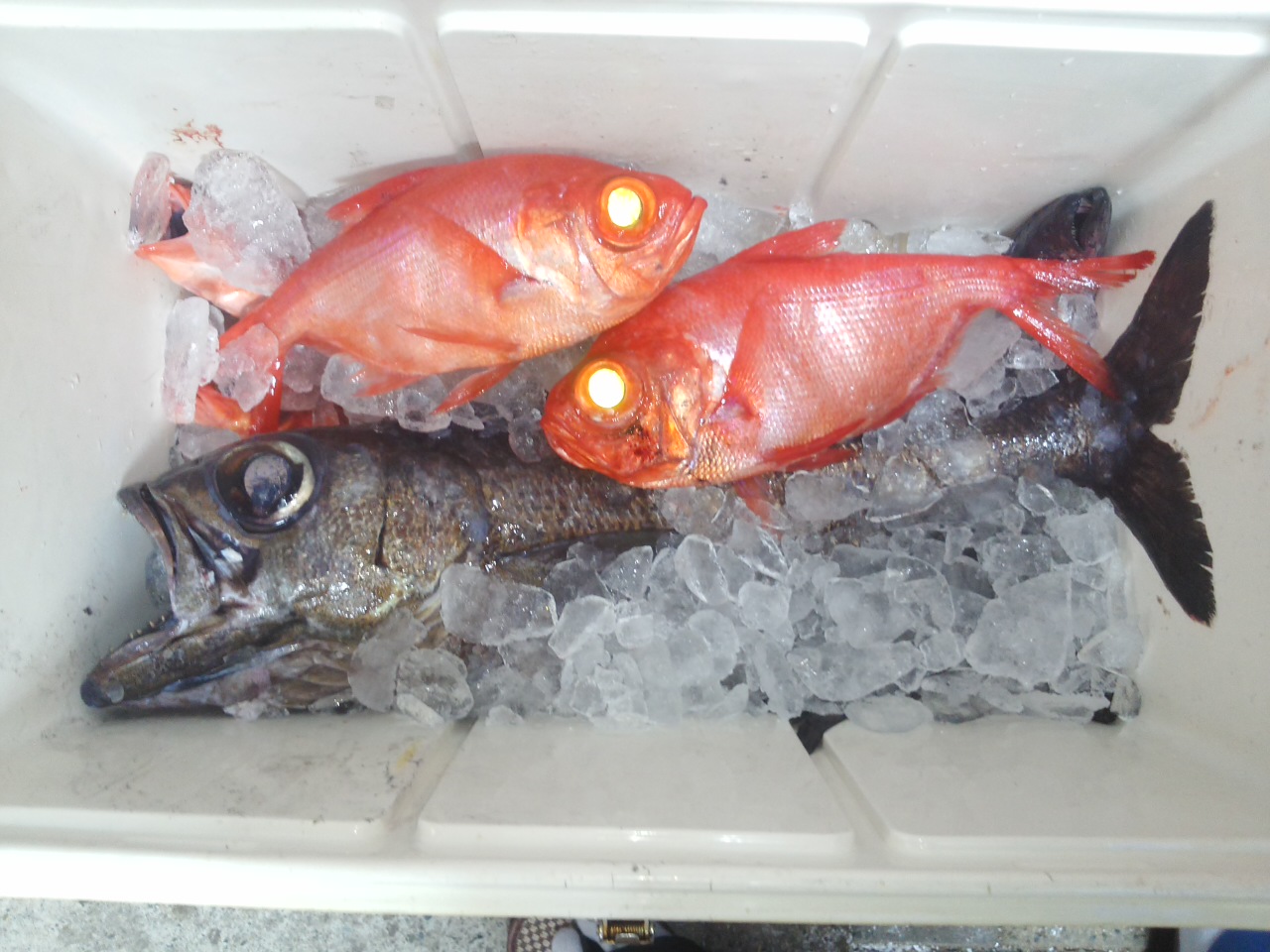 クロムツは大型で4キロ弱あります。 超高級魚です。 たぶん普通には口にすることは出来ないかと思います。 フウセンキンメも今回のサイズならば1匹8000円が浜値です。